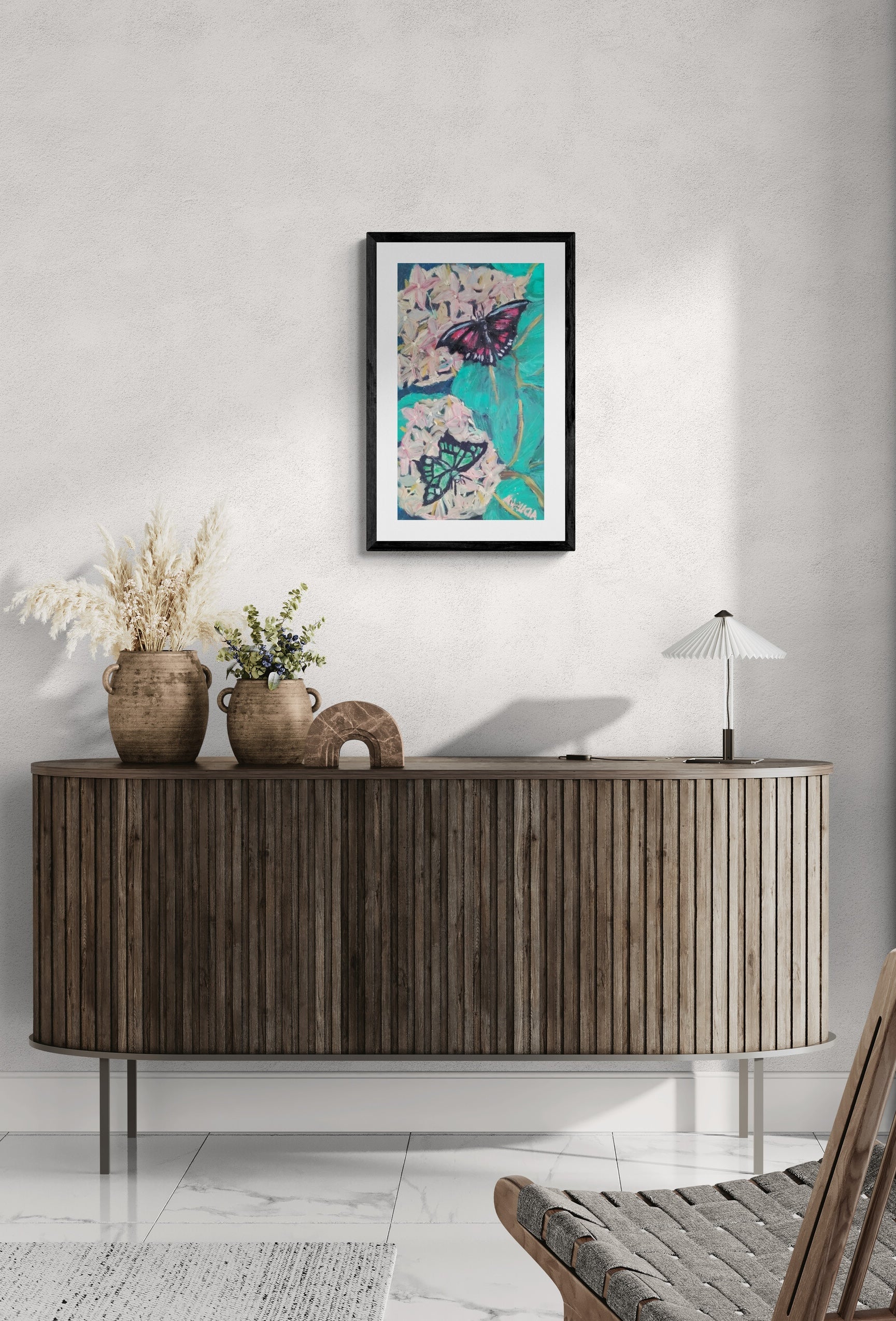 This celebration of movement and vibrancy captures the delicate interaction between butterflies and blooming Ixora flowers. Rich in texture and expressive brushwork, Ana's painting showcases a striking contrast of deep emerald leaves, soft pastel petals, and the bold hues of two butterflies, one in dramatic crimson and black, the other in a luminous green.